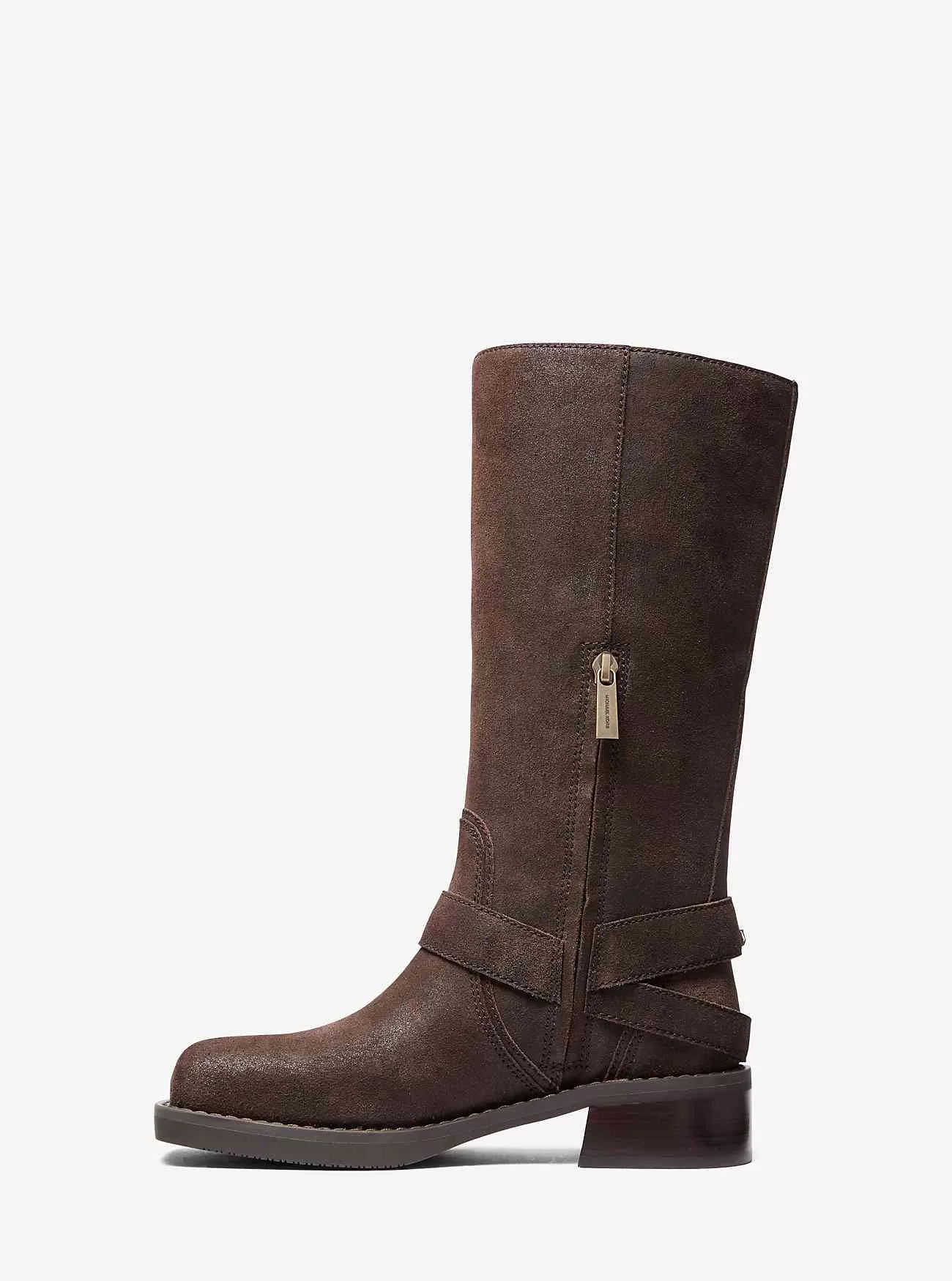 Der Crosby-Motorradstiefel aus Wildleder ist gleichermaßen cool und klassisch und zeichnet sich durch Gurtdetails, polierte Beschläge und eine formschöne quadratische Zehenpartie aus. Ein seitlicher Reißverschluss sorgt für einfaches Tragen, während die Silhouette in der Mitte der Wade perfekt zu allem passt, von fließenden Kleidern bis hin zu maßgeschneiderten Shorts.