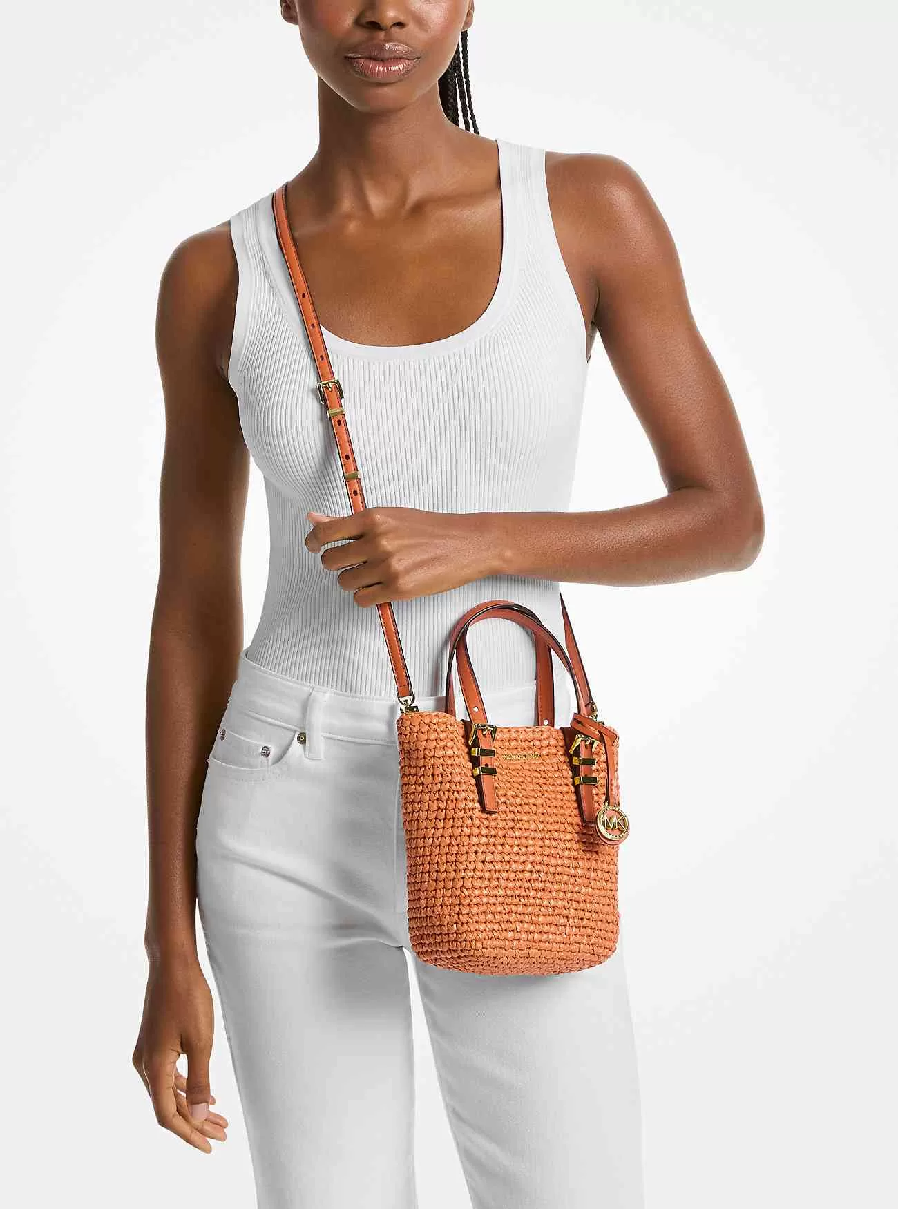 Diese Quinn-Umhängetasche ist perfekt für wärmere Klimazonen und besteht aus gehäkeltem Stroh in einer Tragetaschen-inspirierten Form mit schnallenverschlossenen Tragegriffen oben. Es gibt gerade genug Platz für kleinere Essentials wie ein Telefon, ein Kartenetui und eine Sonnenbrille. Nehmen Sie es mit in den Urlaub und tragen Sie es zu allem, von Badebekleidung bis hin zu Sommerkleidern.