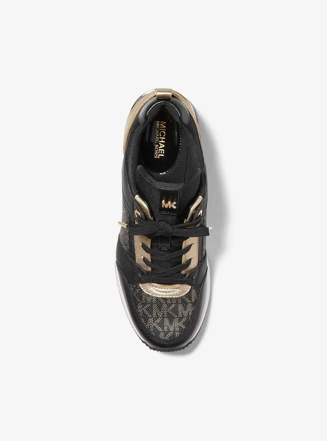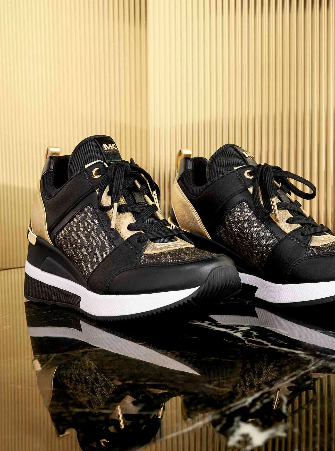 Bringen Sie Abwechslung: Einsätze aus Canvas mit Metallic-Signatur-Print und Wildleder verleihen unseren Georgie-Turnschuhen einen neuen Touch. Dieses sportlich-luxuriöse Paar hat einen Keilabsatz für viel Halt und sieht zu Volantröcken genauso cool aus wie zu Jeans.