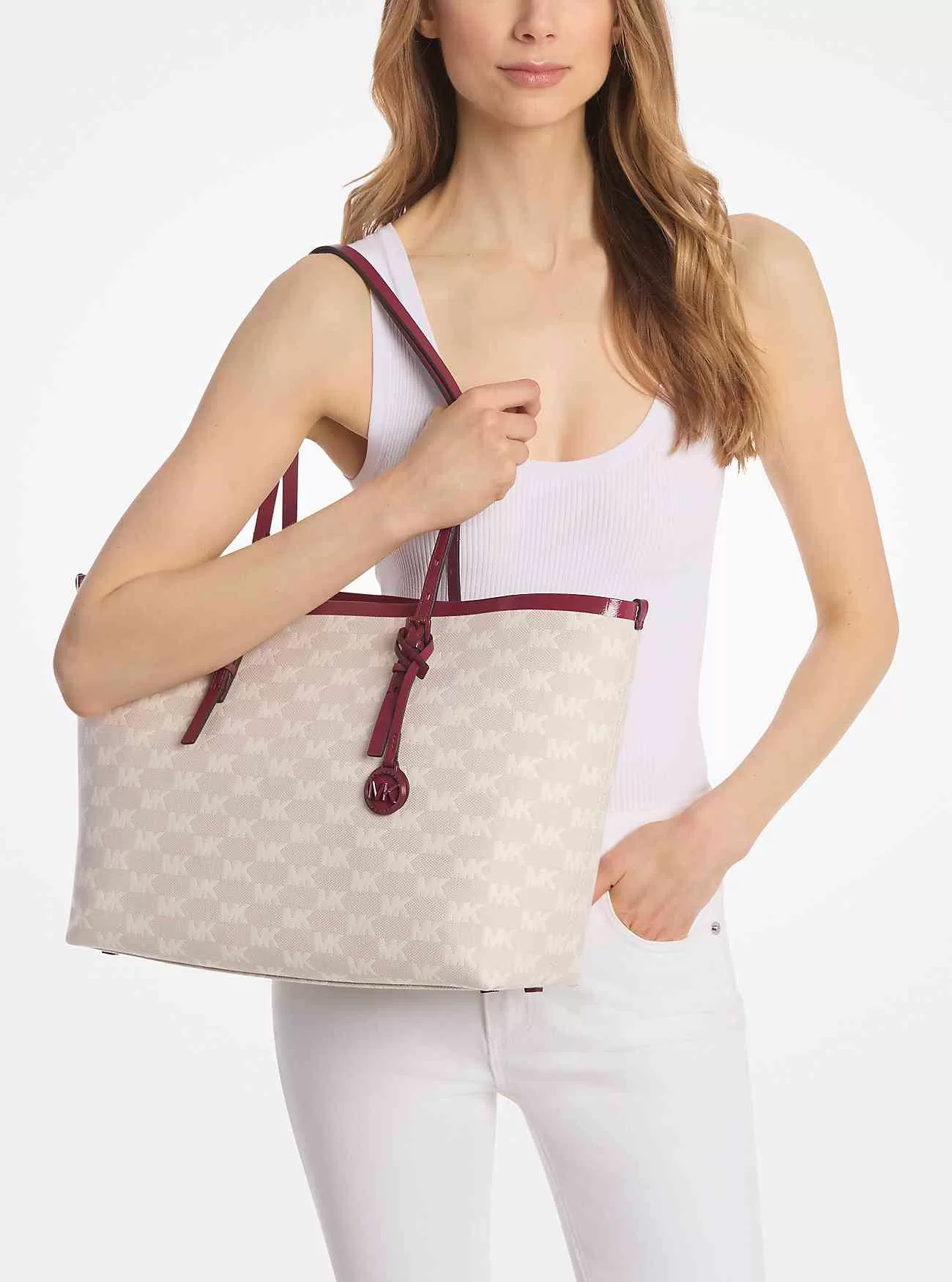 Unsere zeitlose Quinn-Tasche ist ideal für Arbeit, Freizeit und alles dazwischen. Die strukturierte Silhouette ist aus Logo-Jacquard gefertigt und mit glattem Leder besetzt, was den klassischen Reiz noch verstärkt. In seinem geräumigen Innenfach können Sie alles verstauen, von Pendlerschuhen bis hin zu Ihrem Laptop.