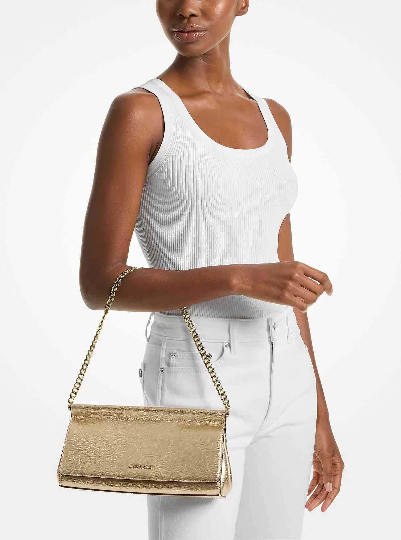 Lernen Sie das ultimative Accessoire für den Abend kennen: unsere Carmine-Pochette. Dieses aus gekrispeltem Metallic-Leder gefertigte Vintage-inspirierte Modell wird durch einen markanten Kettengliederriemen verankert, der über der Schulter getragen oder innen verstaut werden kann, um in der Hand getragen zu werden. Stimmen Sie Ihren Schmuck auf die Hardware ab, um einen glamourösen Look zu erzielen.