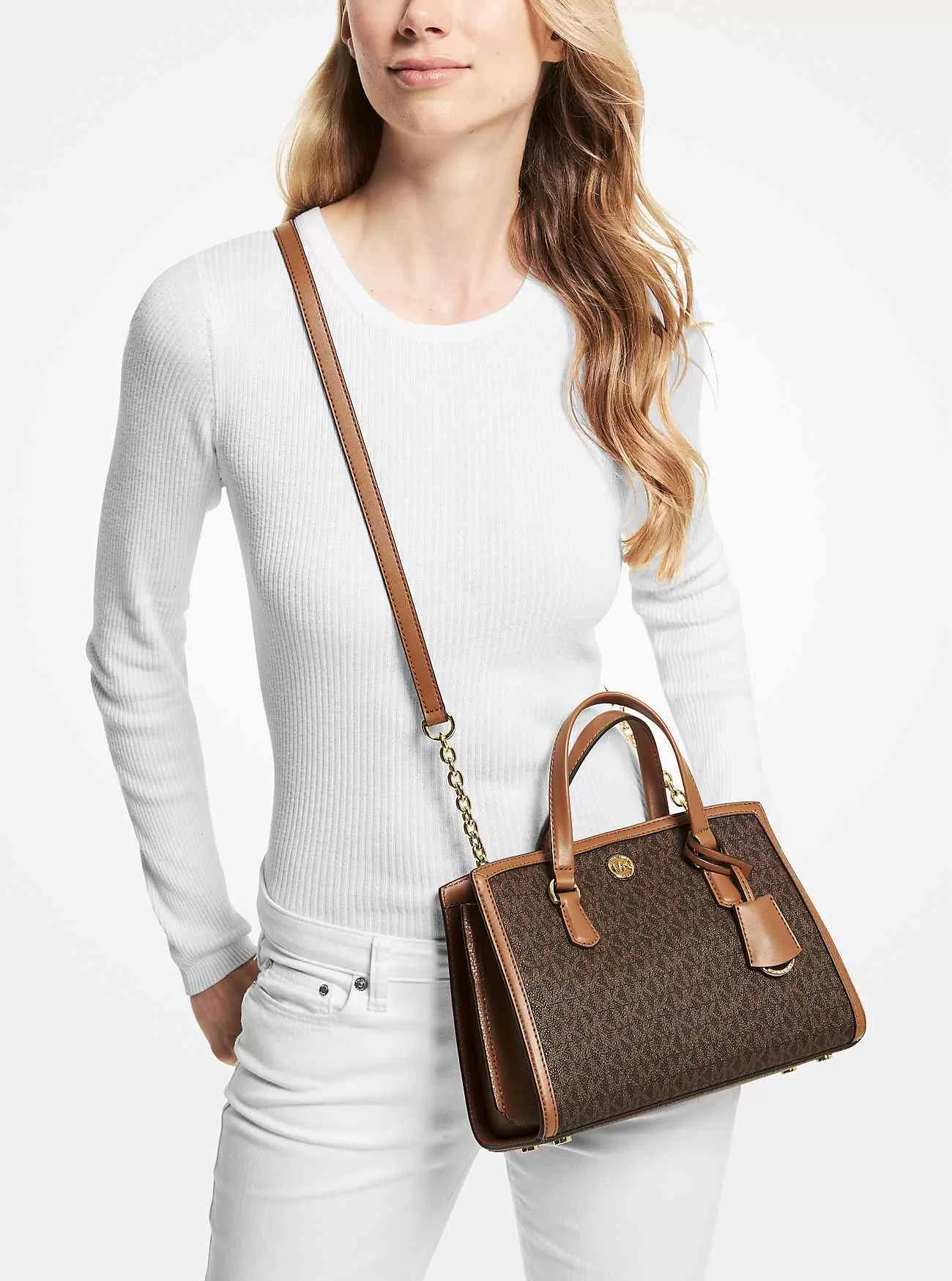 Mit ihrer strukturierten Silhouette und der glamourösen Hardware ist unsere Chantal-Umhängetasche mit Lederbesatz ein Muss in jeder anspruchsvollen Garderobe. Es besteht aus Canvas mit Signature-Print und verfügt über ein Reißverschlussfach, in dem kleinere Gegenstände sicher verstaut werden können. Tragen Sie es an den stabilen Tragegriffen oben oder an geschäftigen Tagen am abnehmbaren Umhängeriemen mit Kettengliedern.