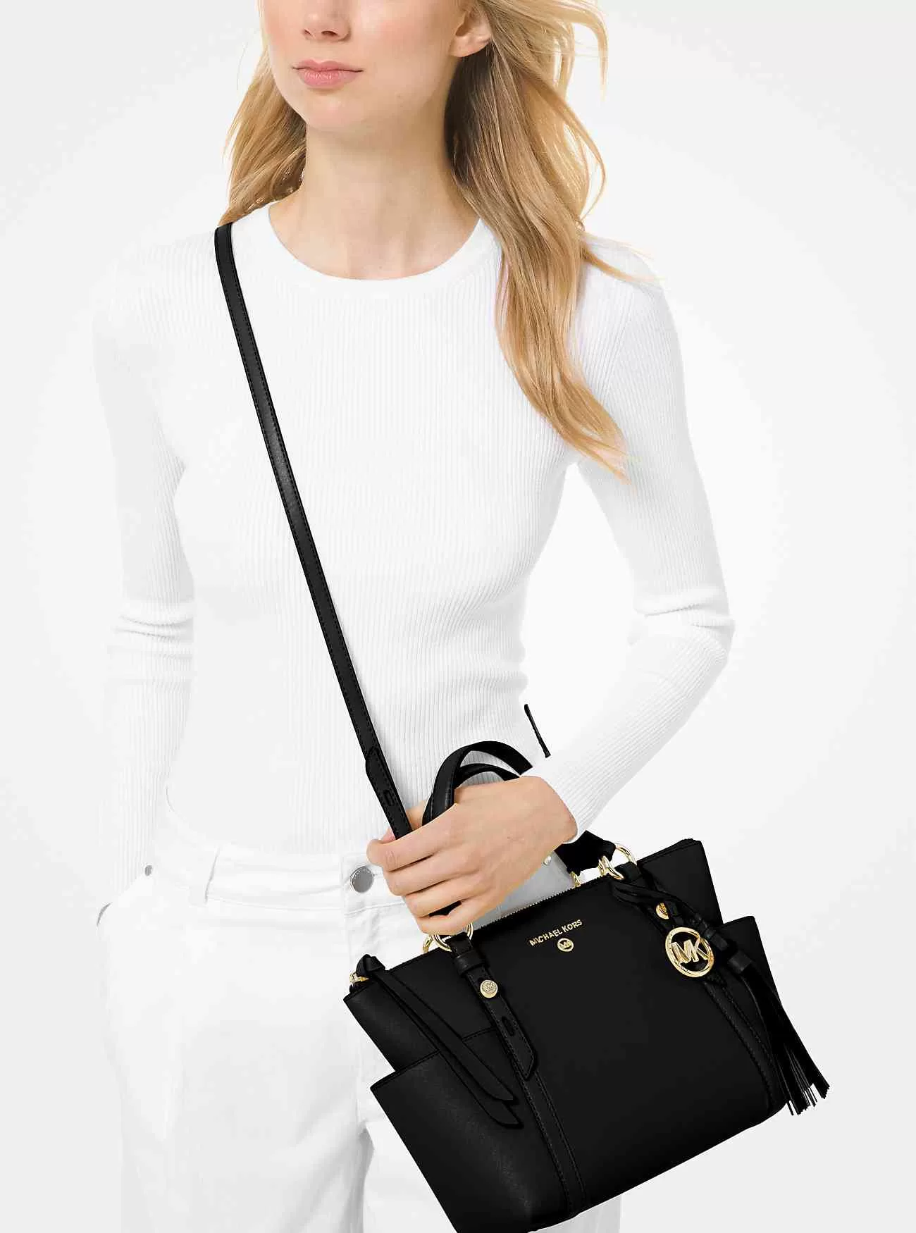 Mit zwei äußeren Seitentaschen – für einfachen Zugriff auf das Nötigste – und einem abnehmbaren Umhängetaschegurt ist die Sullivan-Tragetasche mit Reißverschluss oben eine ideale Tragetasche. Goldfarbene Beschläge und Saffiano-Leder ergeben zusammen einen luxuriösen Effekt, während ein abnehmbarer Logo-Anhänger für den charakteristischen letzten Schliff sorgt.