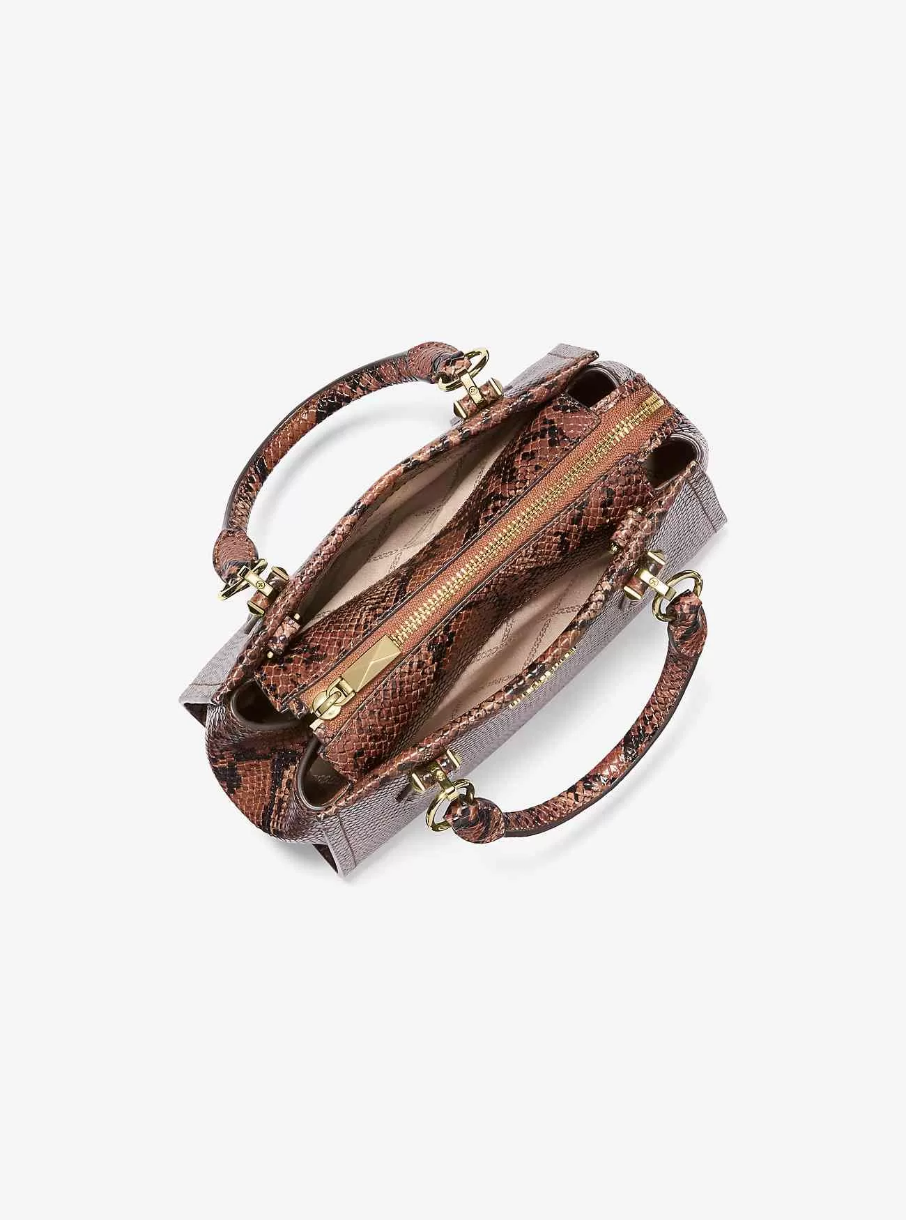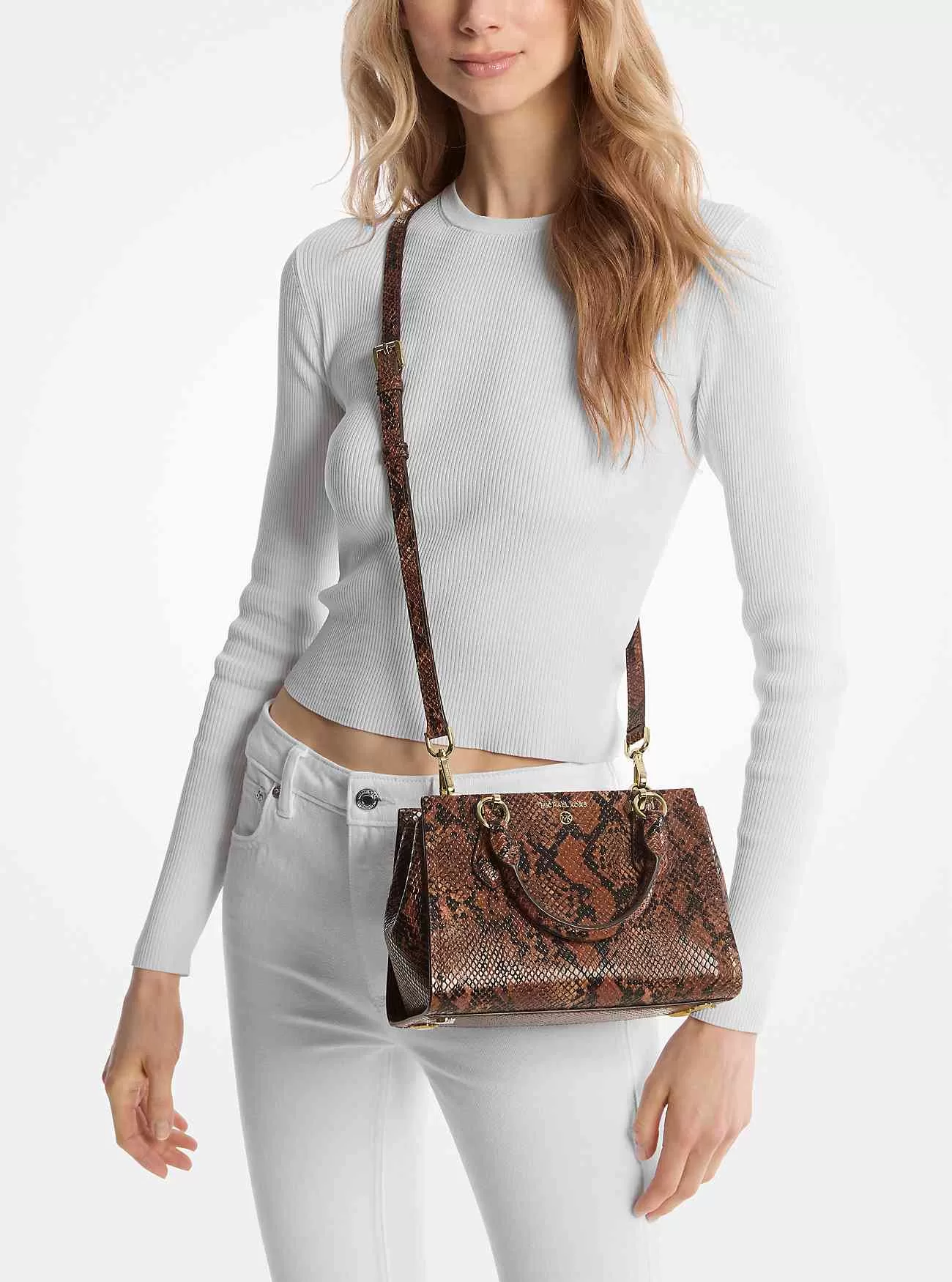 Unsere Marilyn-Umhängetasche rundet jeden Look mit poliertem Charme ab. Es ist aus Leder mit Schlangenprägung gefertigt und verfügt über elegante Akkordeonseiten, eine Reihe von Taschen und einen Druckknopfverschluss, um Ihre wichtigsten Dinge sicher aufzubewahren. Kombinieren Sie es sowohl mit lässigen als auch eleganten Looks.