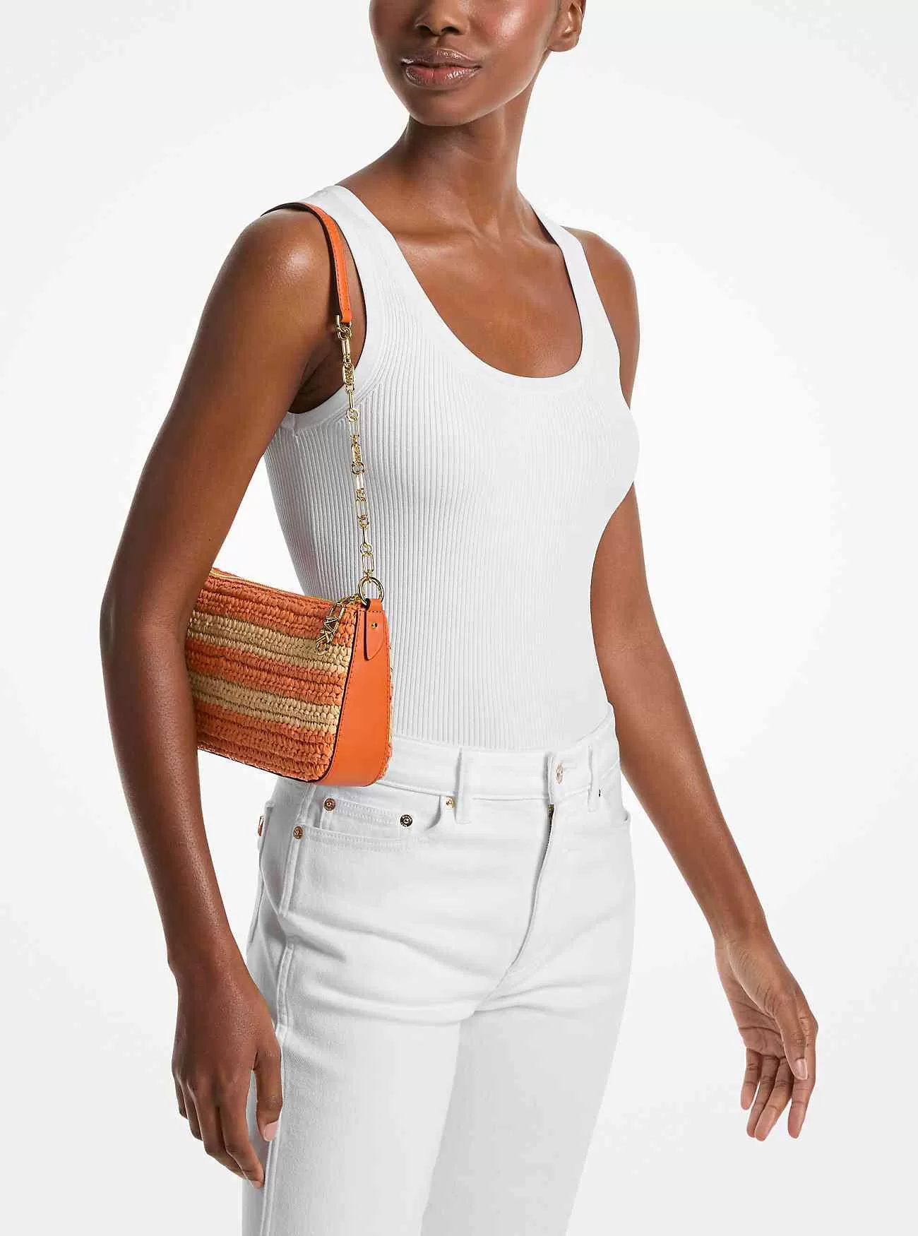 Mit einer handgehäkelten Außenseite aus Stroh ist diese kleine Pochette ideal für die Tage, an denen Sie mit leichtem Gepäck reisen möchten. Die kompakte Silhouette bietet Platz für Ihr Telefon, Kartenetui und Sonnenbrille und verfügt über einen goldfarbenen Kettenriemen, der unterwegs Glamour ausstrahlt.