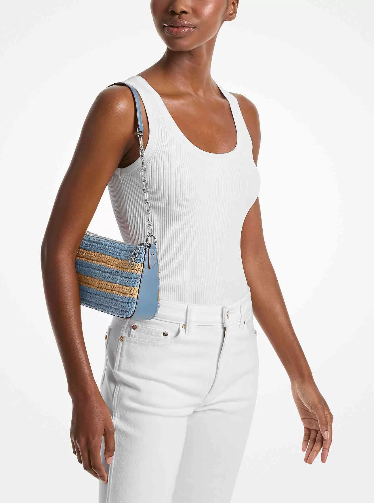 Diese kleine Pochette aus handgehäkeltem Stroh mit bunten Streifen ist ideal für die Tage, an denen Sie mit leichtem Gepäck reisen möchten. Die kompakte Silhouette bietet Platz für Ihr Telefon, Kartenetui und Sonnenbrille und verfügt über einen eleganten Kettenriemen, der unterwegs Glamour ausstrahlt.