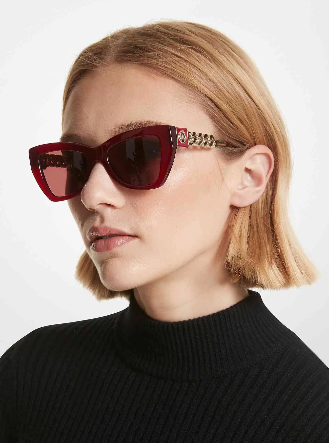 Werten Sie Ihr Outfit mit unserer Montecito-Sonnenbrille auf. Dicke Fassungen in Cat-Eye-Silhouette machen dieses Paar wirklich einzigartig, während Kettendetails an den Schläfen für einen Hauch von Glanz sorgen. Mutig und glamourös – diese lustigen Sonnenbrillen stechen hervor.