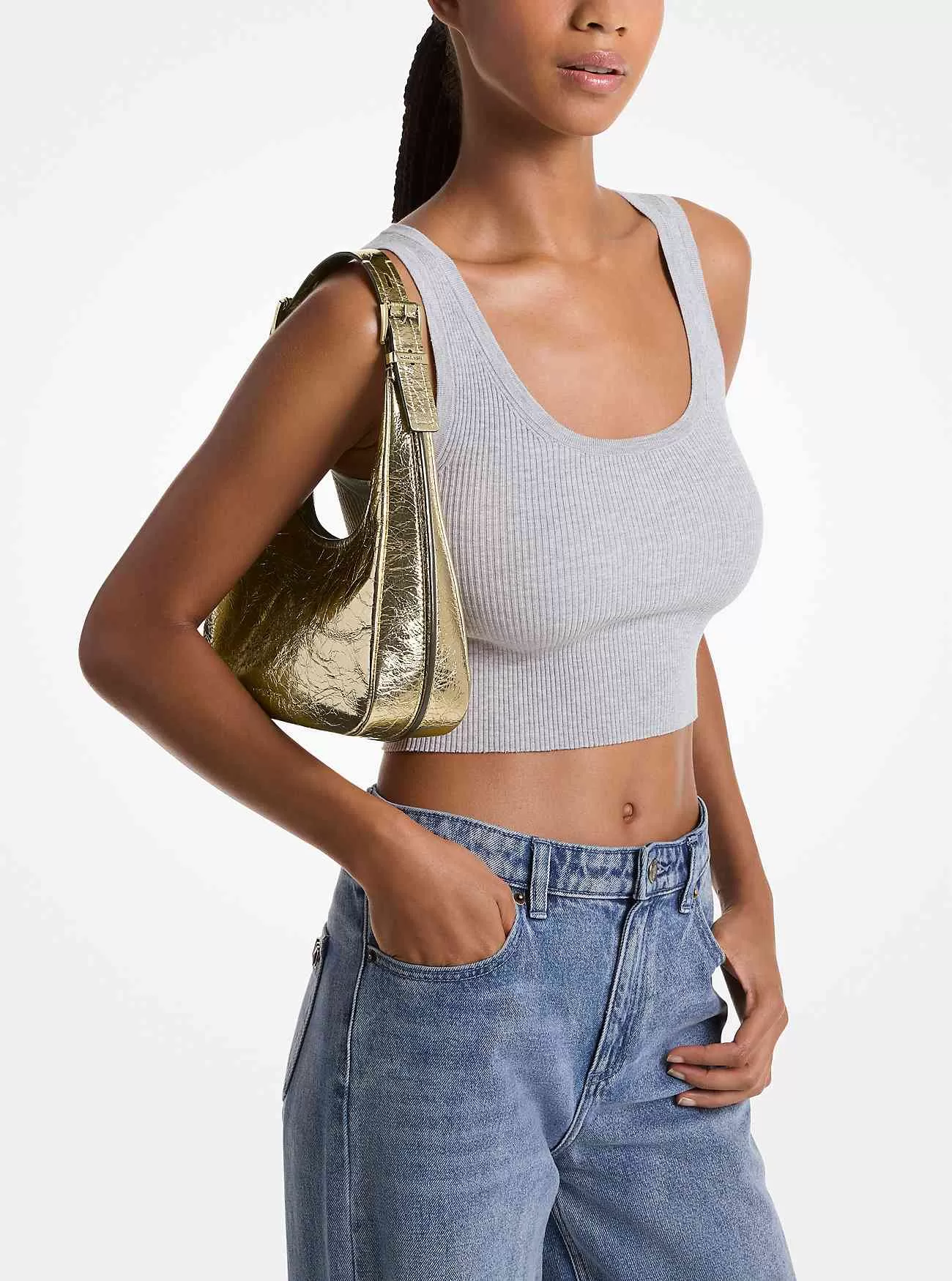 Die metallische Nolita-Hobo-Tasche wirkt entspannt und dennoch raffiniert in geknistertem Leder mit strukturierten Kanten, die ihre Form definieren. Es verfügt über einen verstellbaren Schultergurt mit polierten Schnallen und eine Innentasche zum Verstauen Ihrer wichtigsten Dinge.