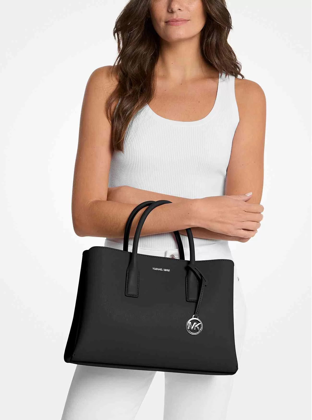 Unsere große Ruthie-Umhängetasche ist eine verkleinerte Version des eleganten Essentials und bietet eine Mischung aus polierten und pragmatischen Elementen in einer mühelos schicken Verpackung. Das aus Saffiano-Leder gefertigte Modell verfügt über eine strukturierte Silhouette, die auf silberfarbenen Nieten ruht und für einen eleganten Look sorgt. Tragen Sie es an den eleganten Henkeln oben oder tragen Sie es quer über dem Körper, wenn Sie unterwegs sind.