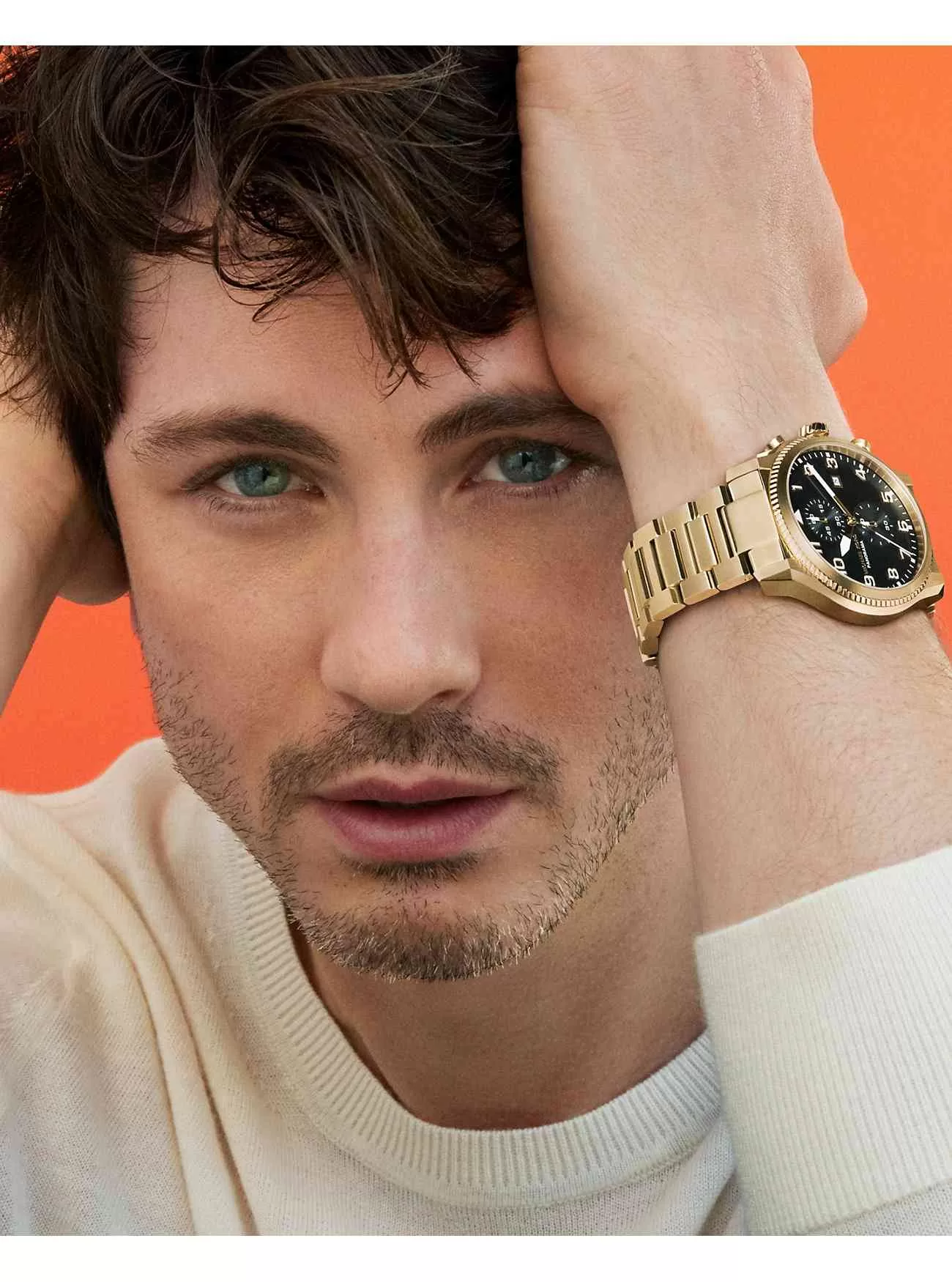 Unsere Panorama-Uhr ist ein raffiniertes Stück für die kommenden Jahre und verfügt über ein goldfarbenes, abgeschrägtes Edelstahlarmband und einen Oberring, der durch ein schwarzes Zifferblatt mit Chronographen-Zifferblättern kontrastiert wird. Verlassen Sie sich darauf, dass Sie an jedem Tag der Woche einen eleganten, sportlichen Look erhalten.