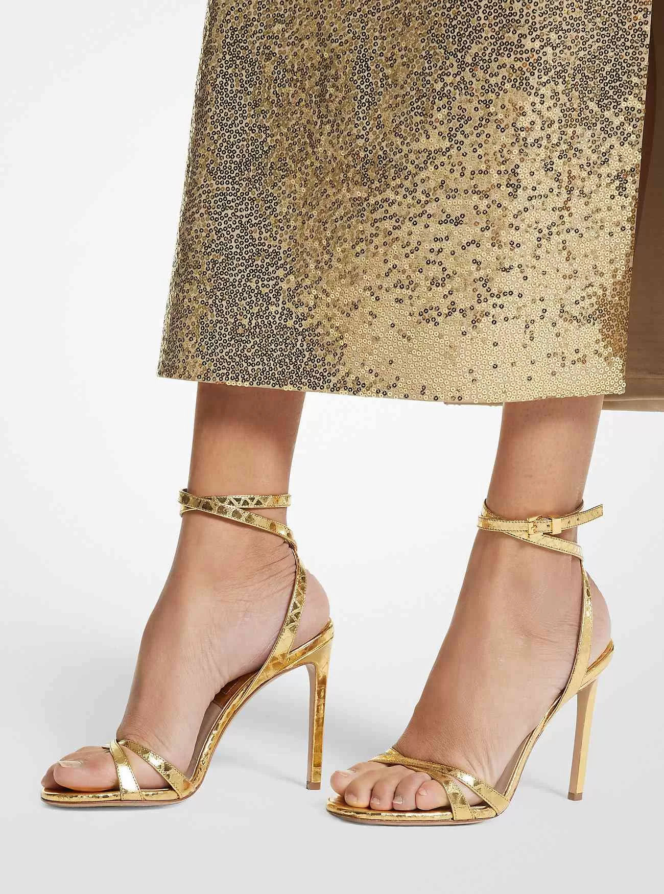 Die Chrissy-Sandalen wurden auf dem Laufsteg der Frühjahr/Sommer-Kollektion 2023 mit Sarongröcken kombiniert und in Italien aus metallischem Leder mit Pythonprägung gefertigt. Sie verfügen über schmale, überkreuzte Riemen an den Zehen und am Knöchel und ruhen auf einem beinverlängernden Stilettoabsatz. Mit ihrer raffinierten und dennoch verführerischen Silhouette werden sie schnell zu Ihren Lieblings-Abendschuhen.