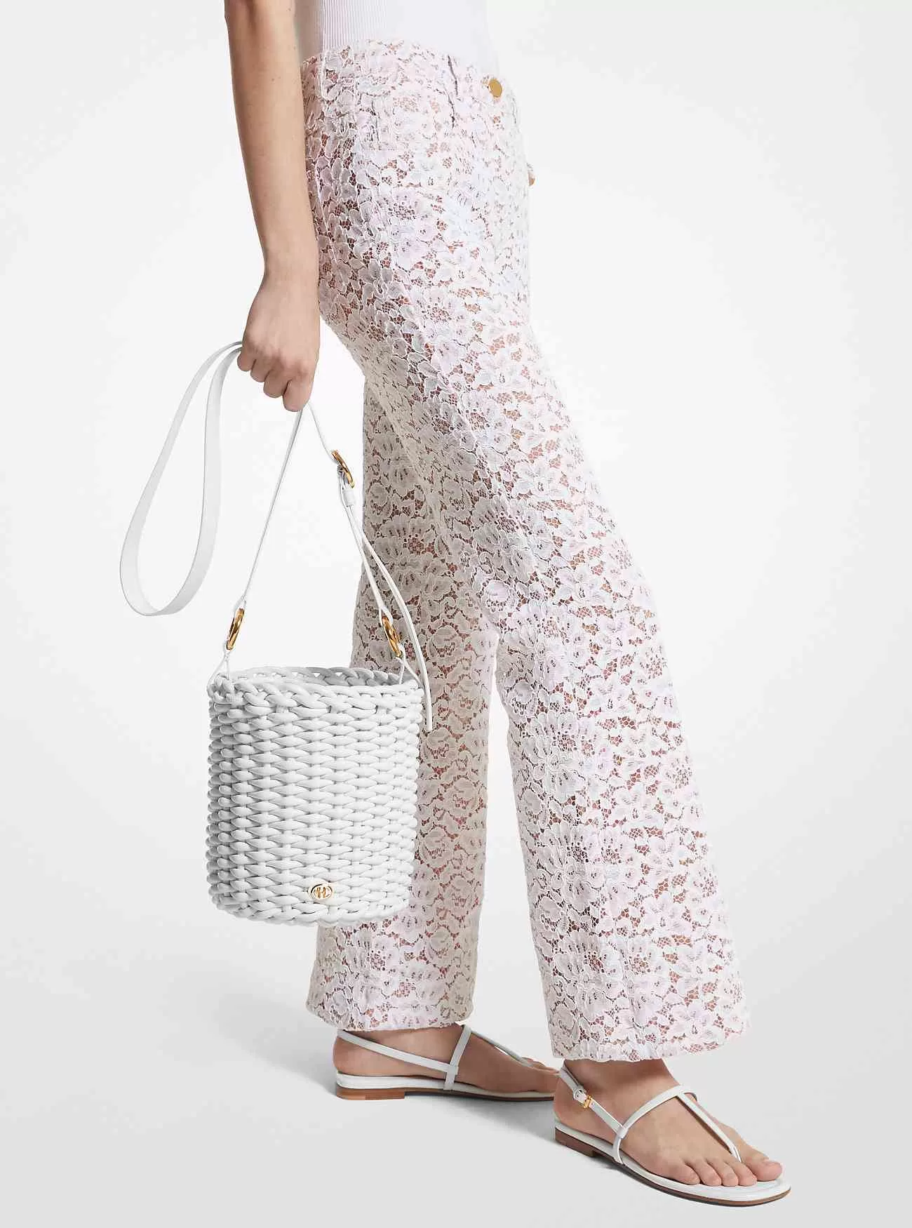Unsere Julie-Beuteltasche feiert ihr Debüt auf dem Laufsteg Frühjahr/Sommer 2024 und ist aufwendig aus Streifen luxuriösen italienischen Leders gewebt und mit minimaler Hardware verziert. Kürzen Sie den verstellbaren Riemen, um ihn über der Schulter mit einem gehäkelten Minikleid zu tragen, oder tragen Sie ihn für einen sportlicheren Look quer über den Körper.