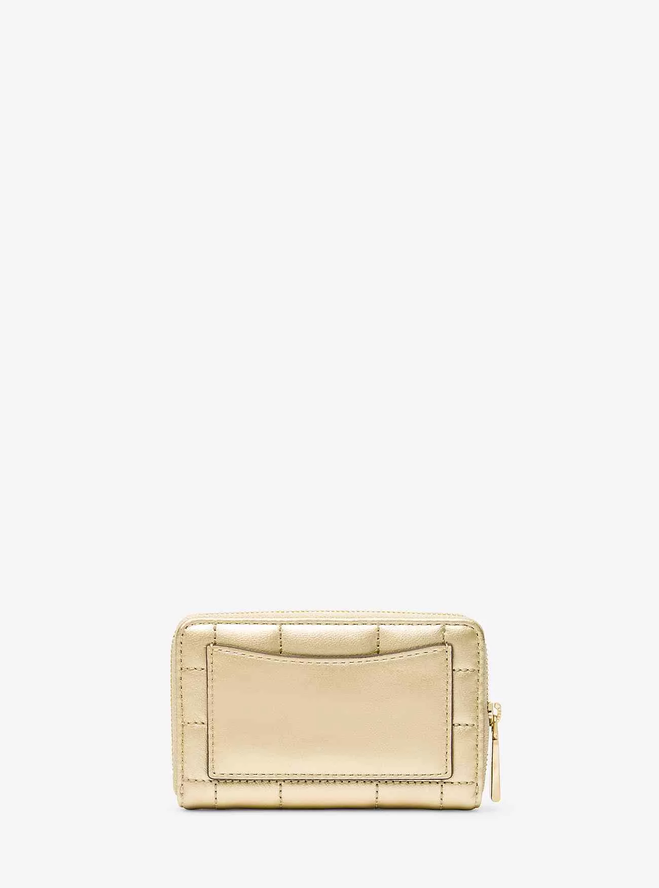 Diese gesteppte Lederbrieftasche hat eine kompakte Silhouette mit umlaufendem Reißverschluss und ist mit einem hochglänzenden Metallic-Finish und glänzenden goldfarbenen Beschlägen versehen. Werfen Sie es als mühelos schickes Accessoire in Ihre Lieblingstasche.