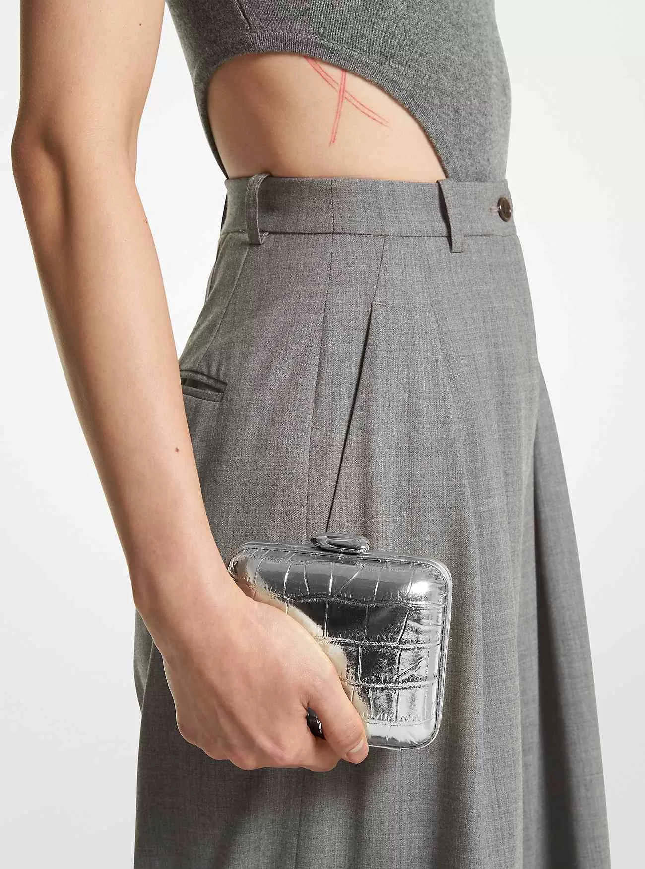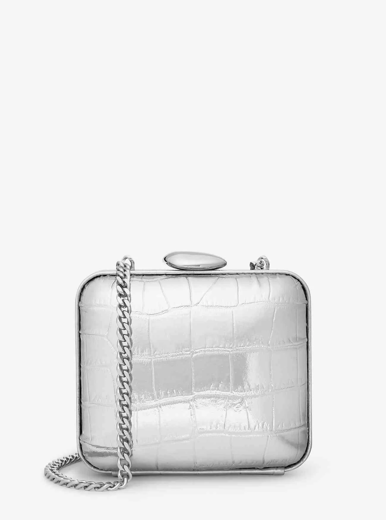 Minaudie re Metallic-Python-geprägtes Leder 100 Leder Silberfarbene Beschläge 5 B x 45 H x 2D Grifflänge 23 Außendetails abnehmbarer Riemen Futter 100 Wildleder Druckknopfverschluss Hergestellt in Italien